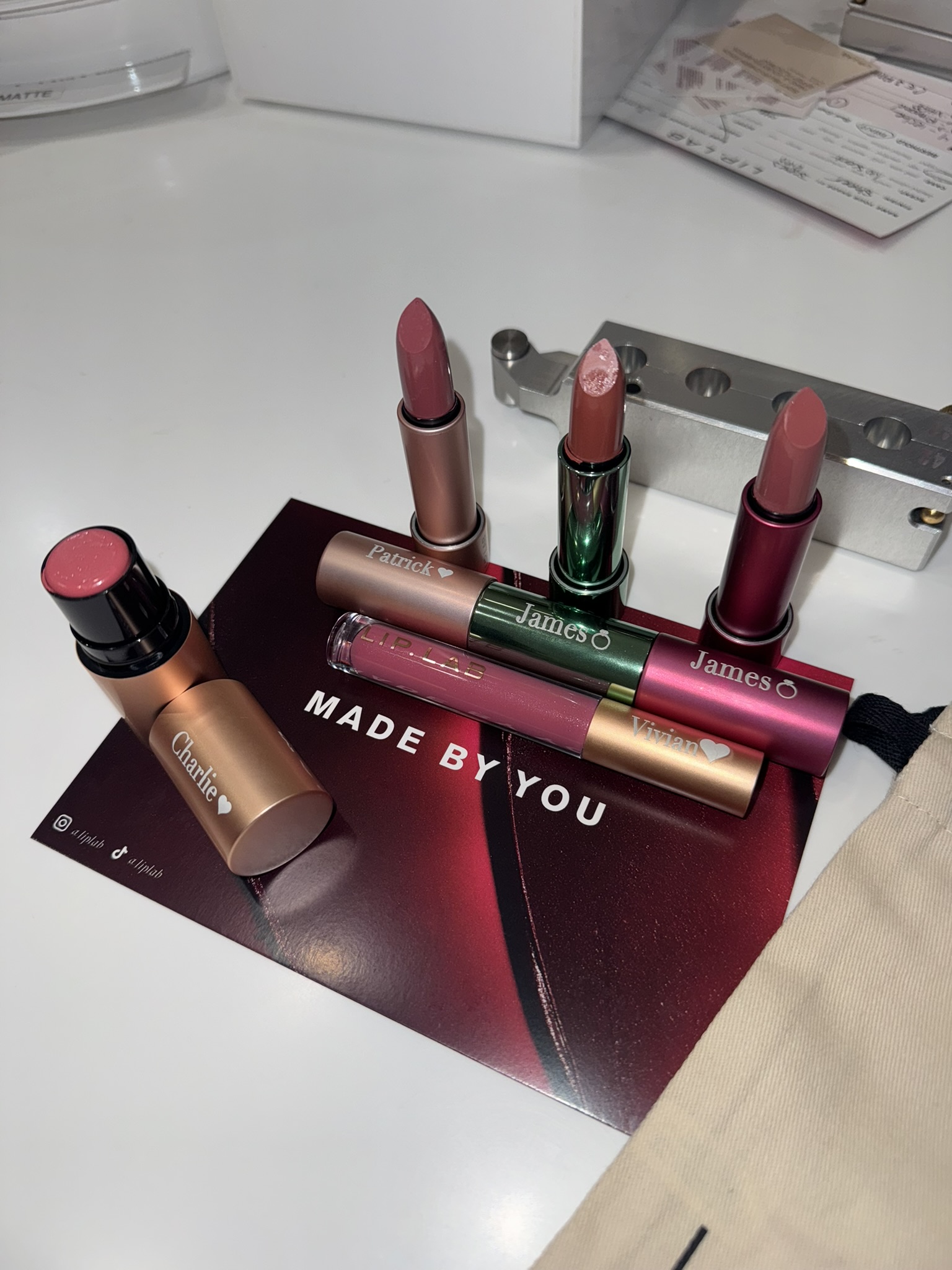 Two of the girls made both a lipstick and a gloss, the bride designed a lipstick and a blush, and I created a lipstick and a matching liner. The best part was watching the artists mix pigments right in front of us, adjusting each tone until it felt like the perfect match. Once we finalized our colors, we got to personalize the packaging with our names and shade titles — a small detail that made it feel truly custom.