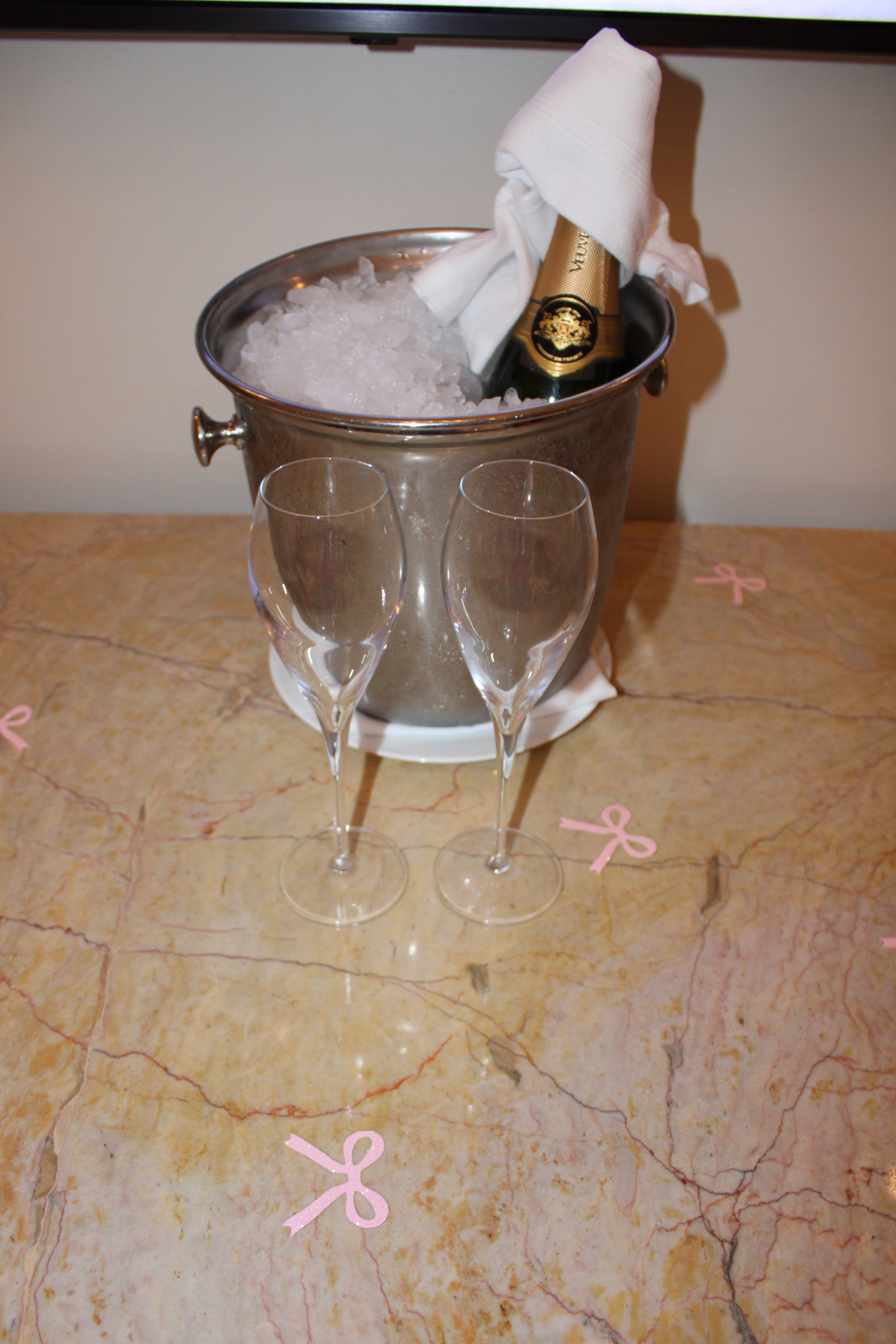 Waiting in our room was the sweetest surprise — a complimentary bottle of Veuve Clicquot champagne and Just Water boxed water, the perfect welcome before starting our weekend.