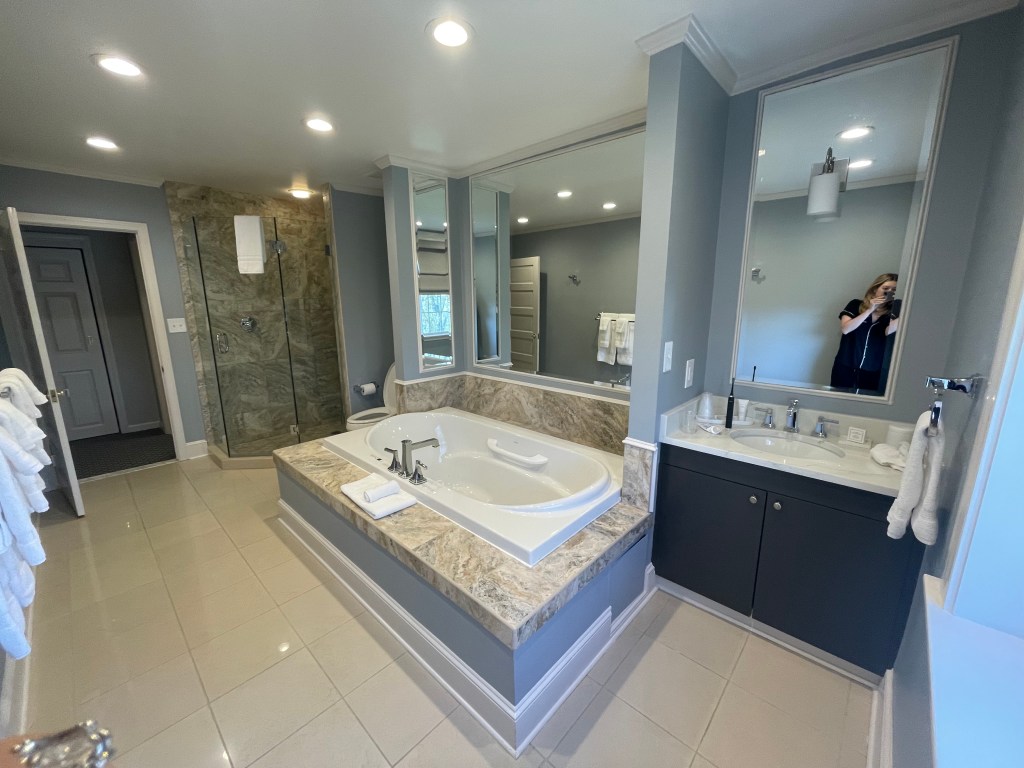 Our room was a mix of classic charm and modern comfort — think soft linens, marble-topped vanities, and a deep soaking tub that practically begged for a post-spa bubble bath.